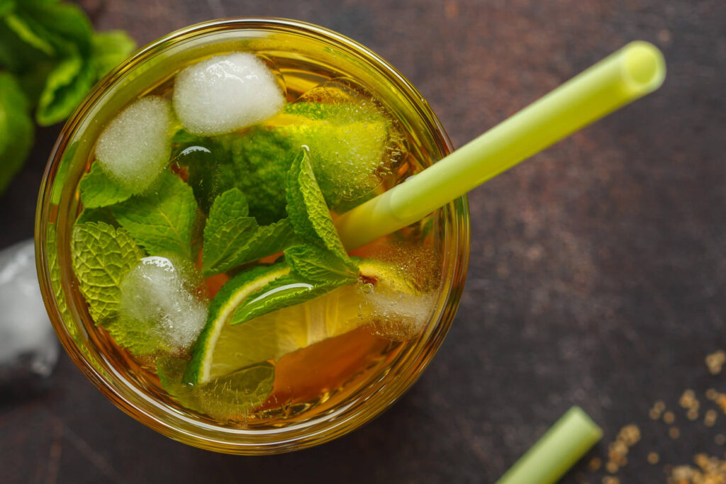 - MINZE ZUGEBEN:Minze leicht zwischen den Händen „anklatschen“ (damit die ätherischen Öle frei werden) und in die Limonade geben.